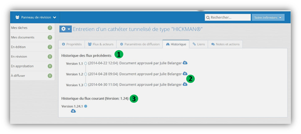 - Historiques des flux précédents: Permet de voir l'historique des versions et de télécharger les versions antérieures du document.