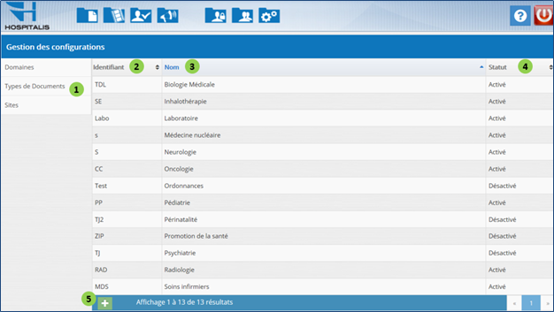 La gestion des configurations comprend 3 modules, soit : la gestion des domaines, la gestion des types de documents ainsi que la gestion des sites. Par défaut, cette interface montre la liste des domaines et affiche les éléments suivants :