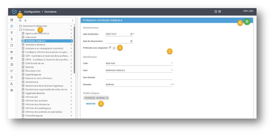 4. Profession avec assignation : indique que les cliniciens de cette profession sont assignés à des poste de travail (présences).