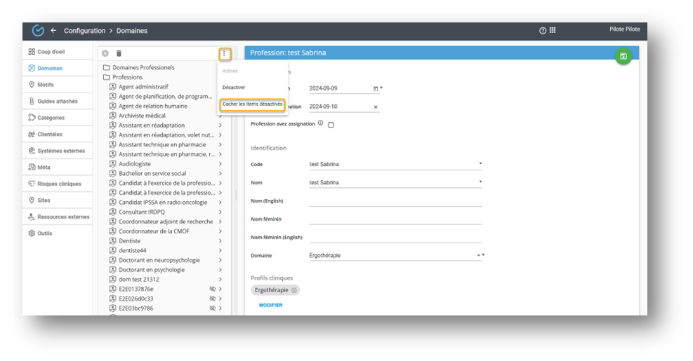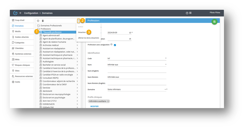 Note: Veuillez attendre au moins 1 jour après la date de désactivation pour que la profession désactivée n’apparaisse plus dans la liste.