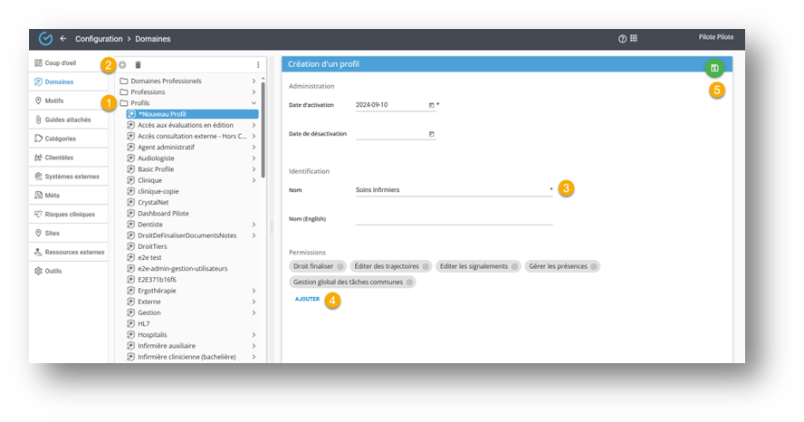 - À partir du bouton «Ajouter» sélectionner les permissions qui seront disponibles pour le profil