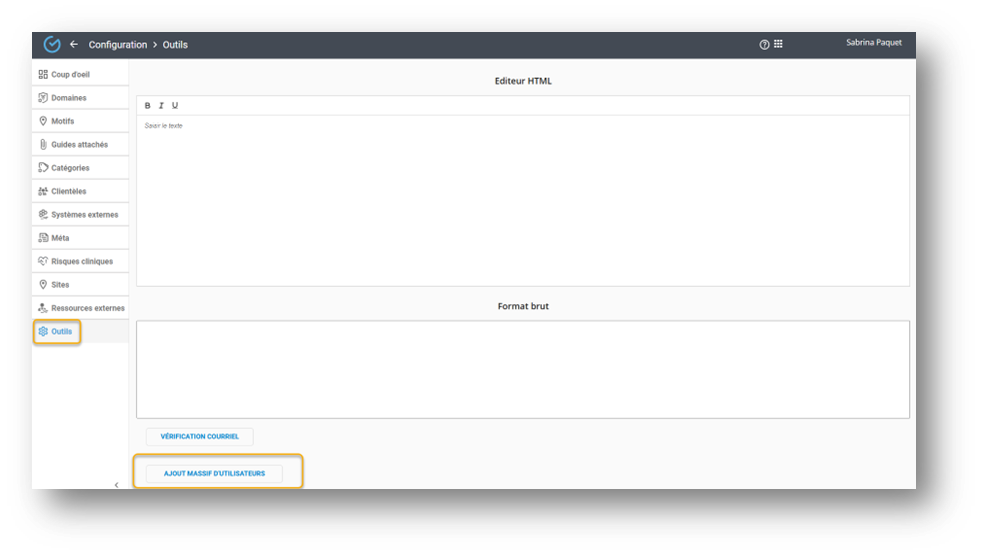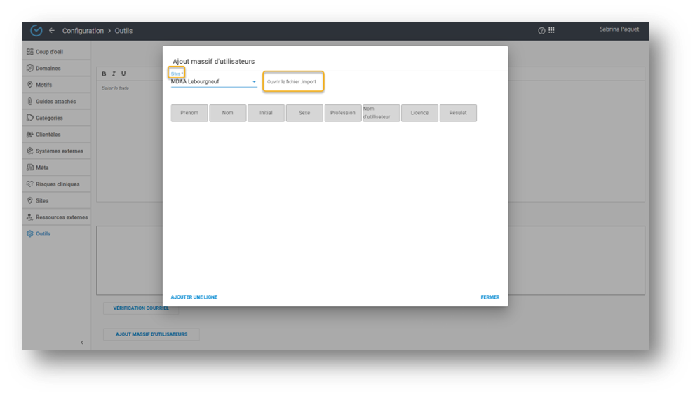 Un gabarit est disponible, contactez le fournisseur. Il est obligatoire d’utiliser le format csv utf-8. Ensuite, téléverser le document Excel, sélectionner le site et Lancer l’insertion des utilisateurs :