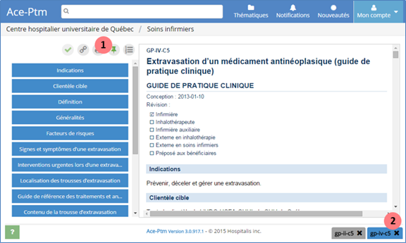 - Permets de naviguer vers le ou les documents épinglés. Pour faire disparaître l’onglet, cliquer sur le « x ».