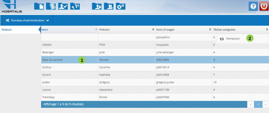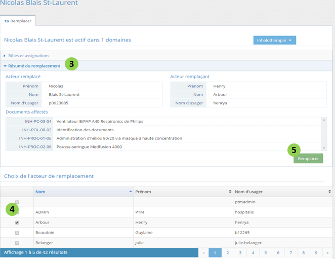 Le panneau d'administration permet de gérer le remplacement d'un acteur ayant des tâches assignées, par un autre acteur. Cette fonctionnalité donne accès à la liste des rôles et statuts des acteurs à remplacer.