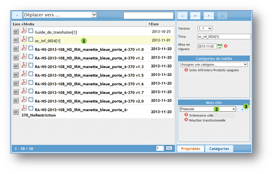 Cette fonctionnalité permet d’assigner des mots clés qui pourront être saisis dans le moteur de recherche par l’utilisateur. Lorsqu’un mot clé est saisi, une liste des documents comprenant le média avec le terme recherché s’affichera à l’écran.