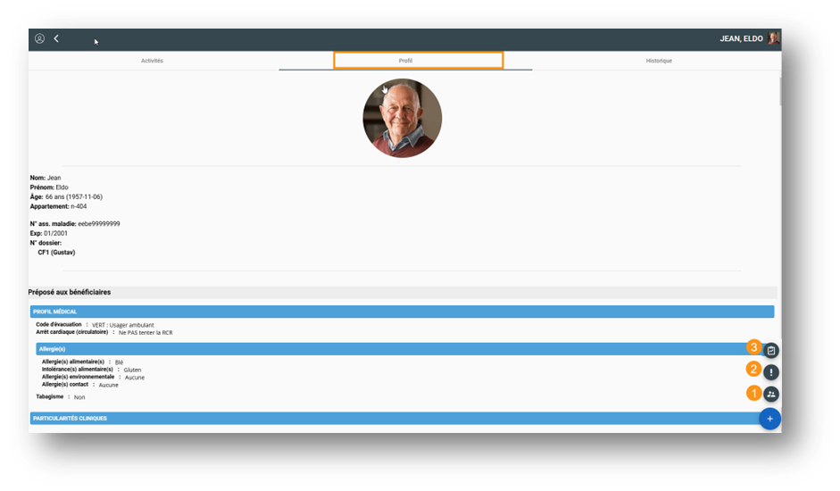 Le volet profil affiche l’information et un portait global de l’usager. Les boutons suivants sont disponibles lorsque le + est sélectionné :