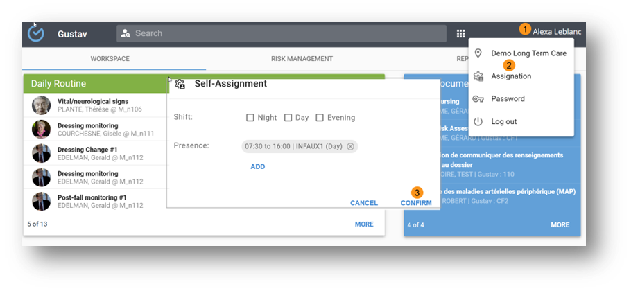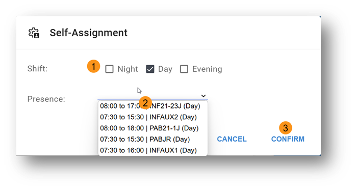 This feature is designed for users with work routines derived from care plans. It allows users to assign themselves to one or more shifts to access their work routines for those shifts. The list of presences is displayed based on the user’s rights to complete activities for their profession. For exemple: