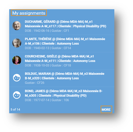 This tile displays the list of users assigned to the logged-in user for their shift. Clicking the "MORE" button provides access to a detailed view.