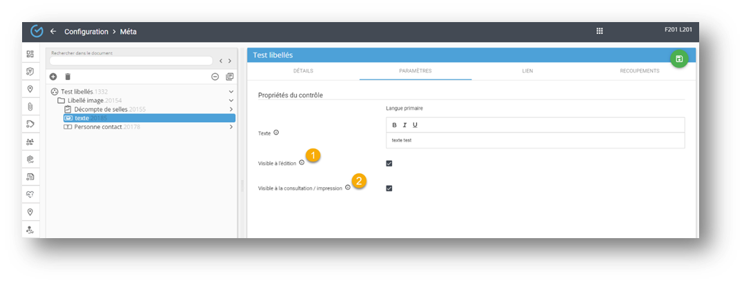 - Visible à la consultation/impression : si coché, indique que le texte du libellé sera visible en mode consultation et impression