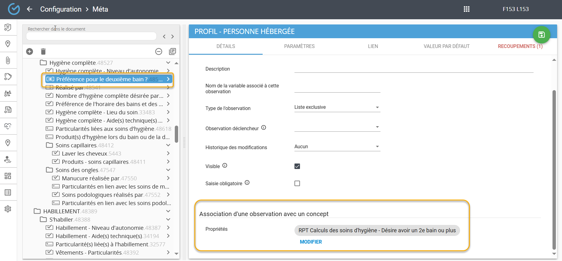 Cette observation doit être associée d'abord à un concept du rapport '' RPT Calculs des soins d'hygiène-Désire avoir un 2e bain ou plus '':