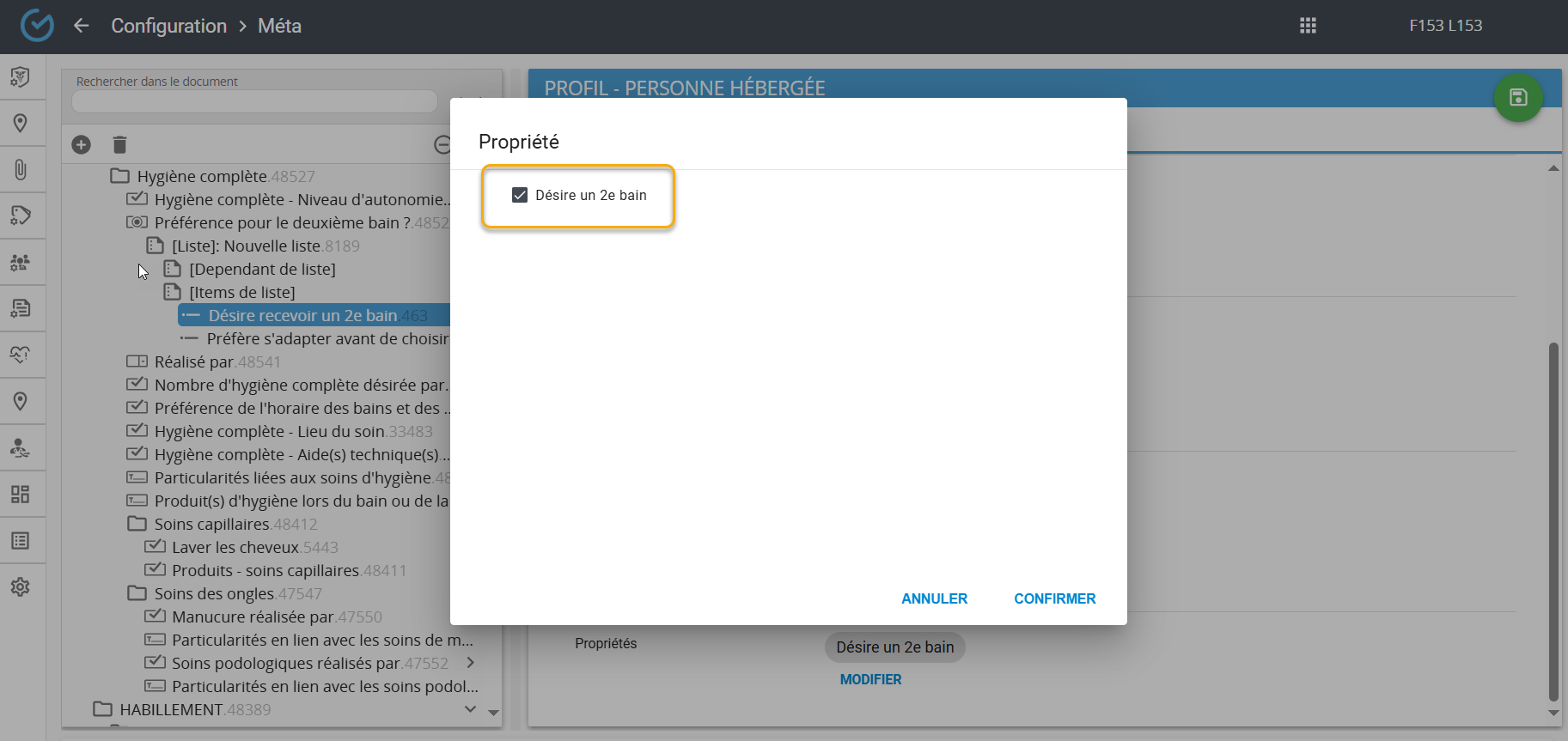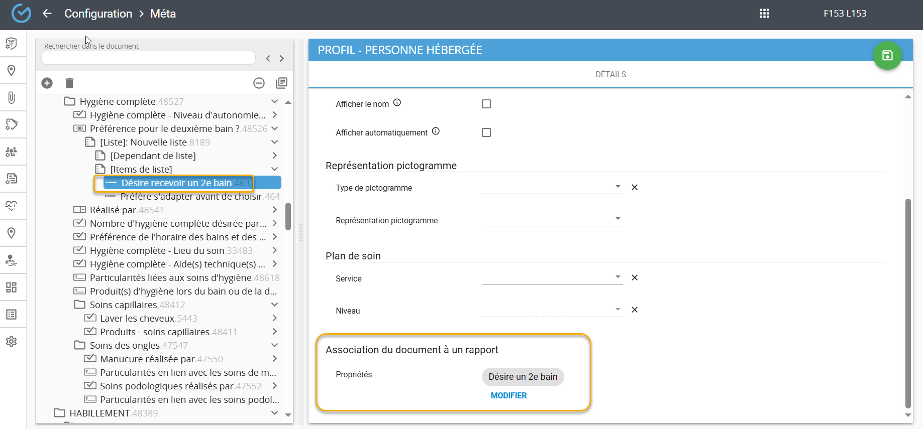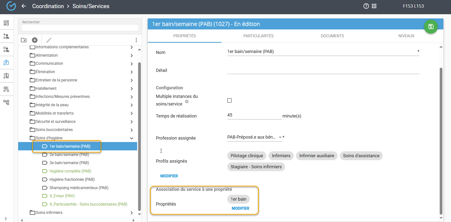 Dans le module Coordination-Soins/Services, chacun des services de bains doit être associé à la propriété correspondante. Par exemple, le 1er bain est associé à la propriété ''1er bain'':