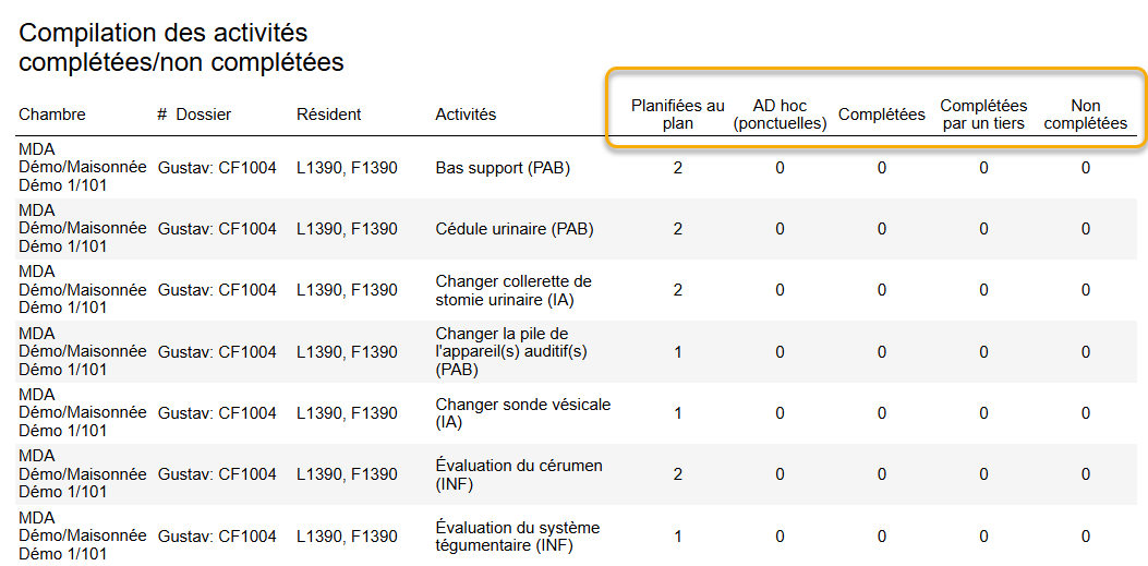 Ce rapport affiche les activités complétées et non-complétées planifiées au plan de soins de l'usager.