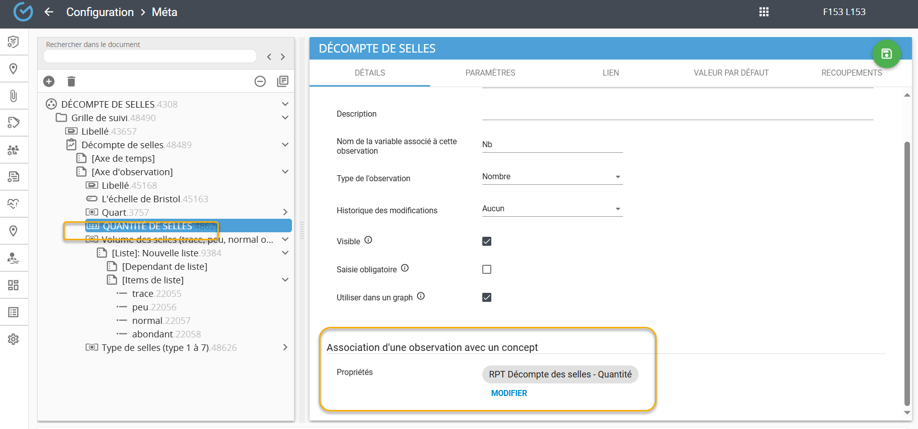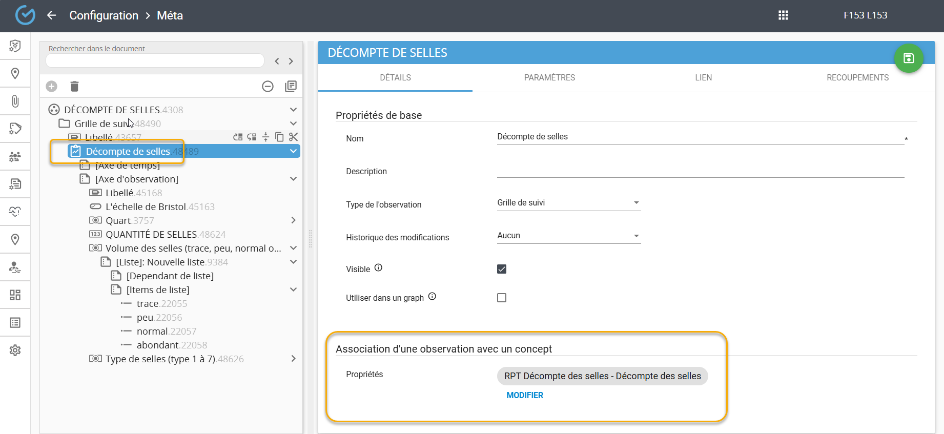 La grille de suivi doit être associée à la propriété ''RPT Décompte des selles-Décompte des selles'':