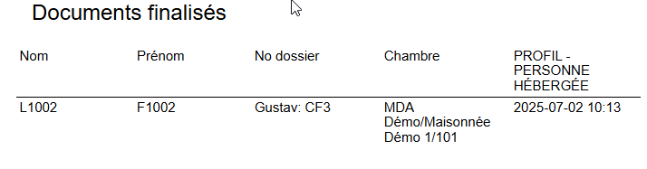 Le rapport affiche la première finalisation d'un formulaire pour un patient ayant un séjour actif.