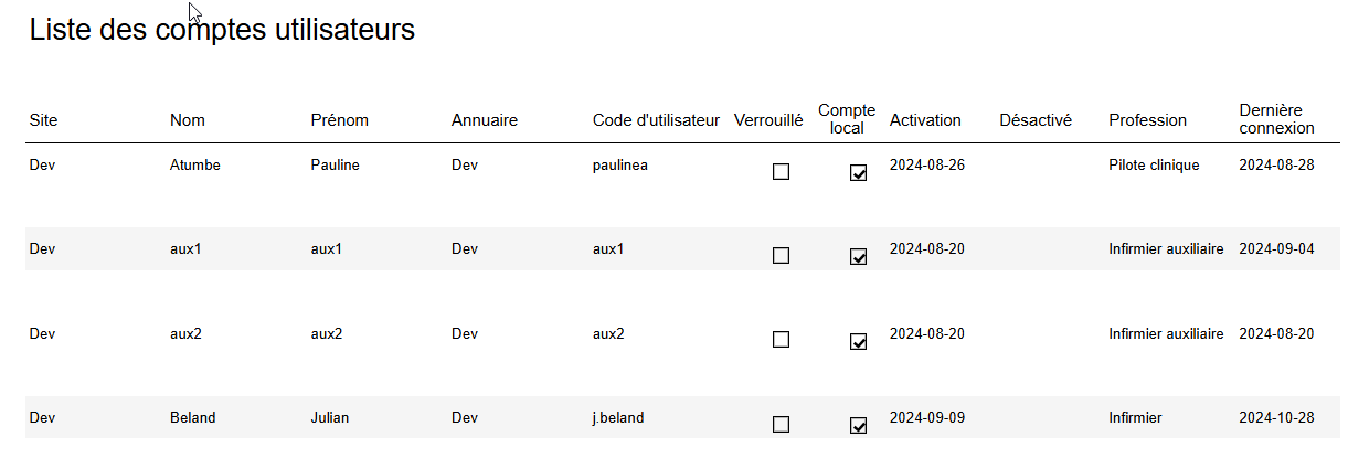 Ce rapport affiche la liste des comptes utilisateurs incluant entre autre le statut, la profession et la date et heure de la dernière connexion.