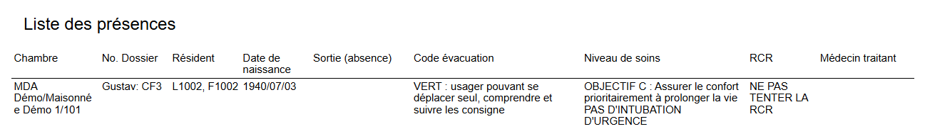 Le rapport affiche les informations saisies pour un patient ayant un séjour actif.