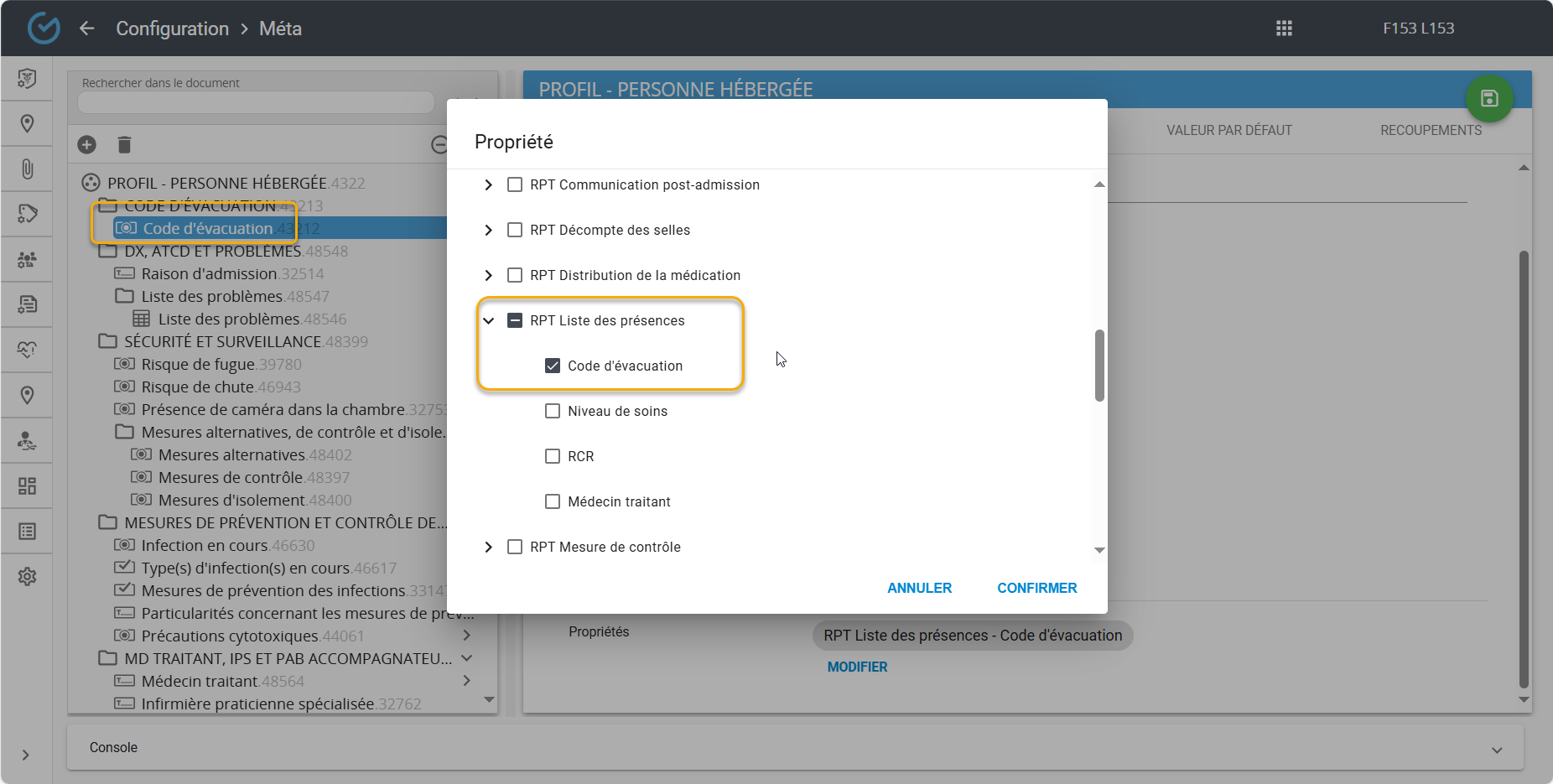 - Code d'évacuation : Liste déroulante, Liste exclusive, Liste inclusive, Texte