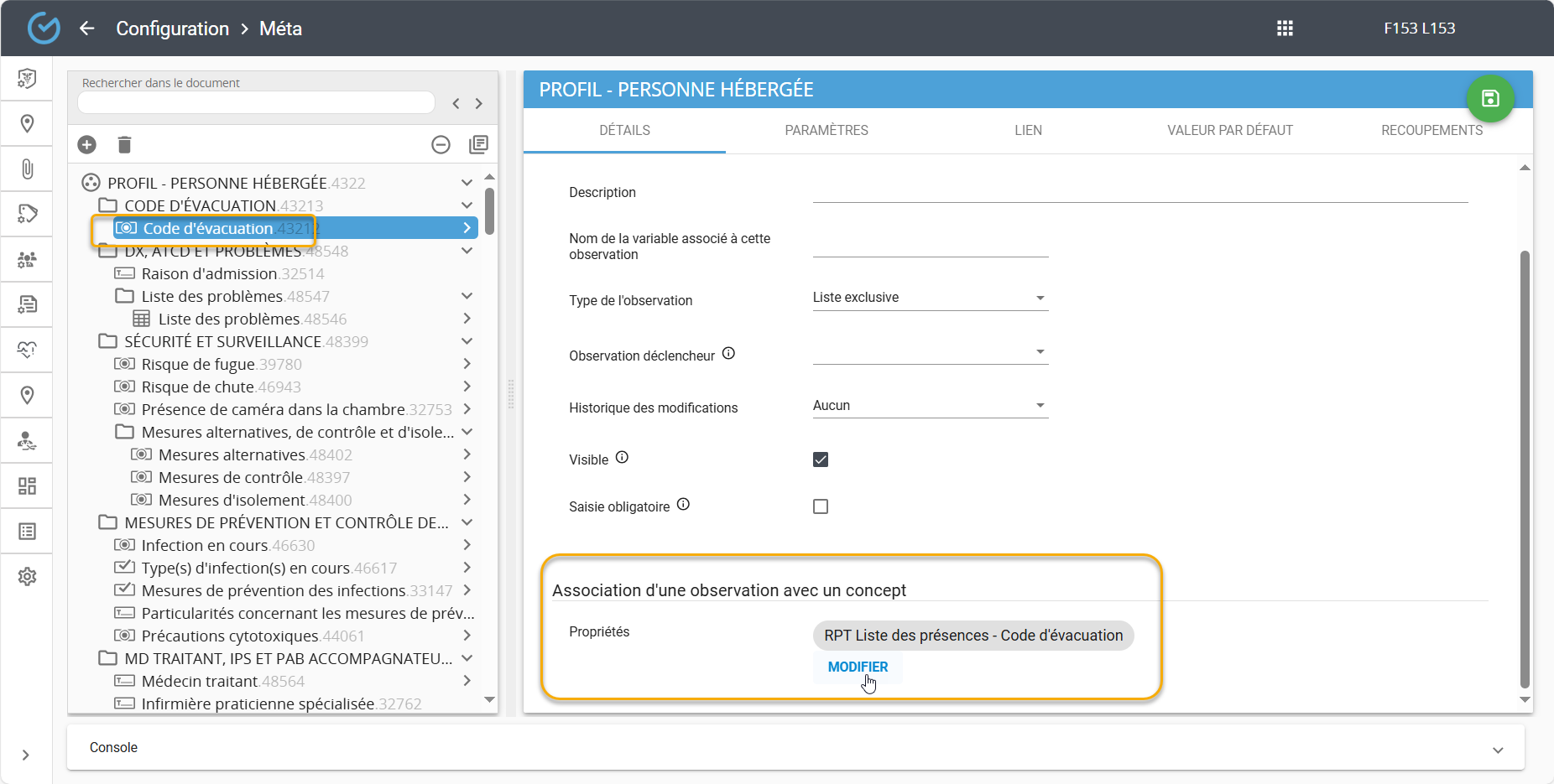 Chacune de ces observations doivent être associées à la propriété correspondante. Par exemple, l'observation ''Code d'évacuation'' doit être associée à la propriété ''Code d'évacuation'' de ce rapport: