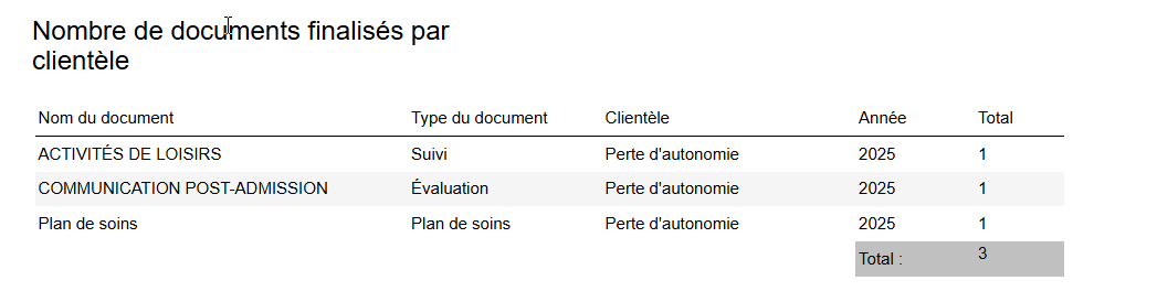 Ce rapport affiche les documents finalisés, par clientèle, des usagers ayant un séjour actif.