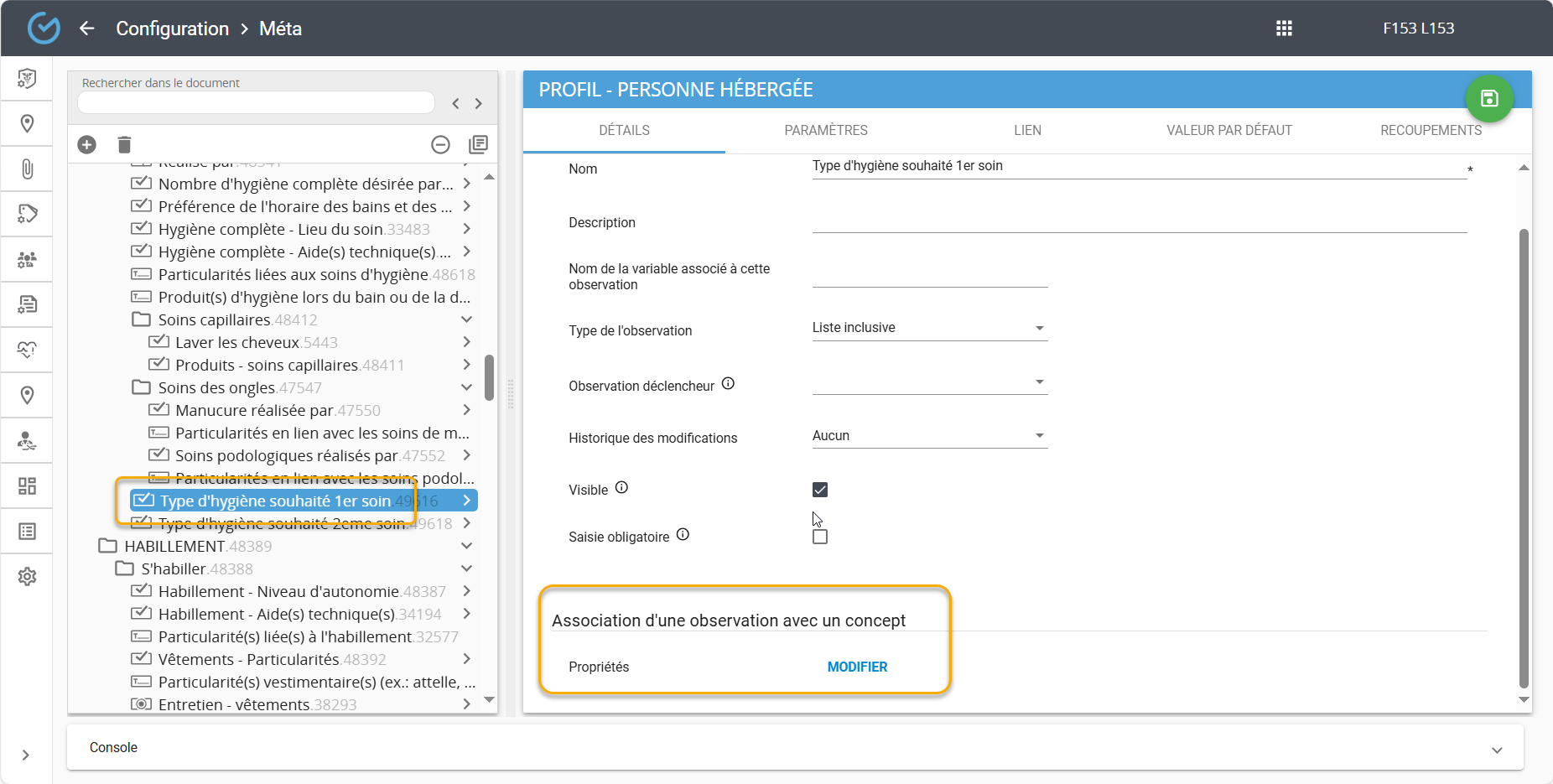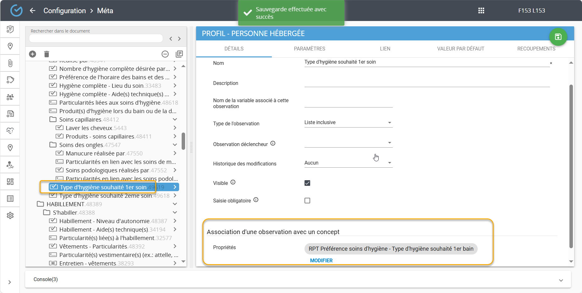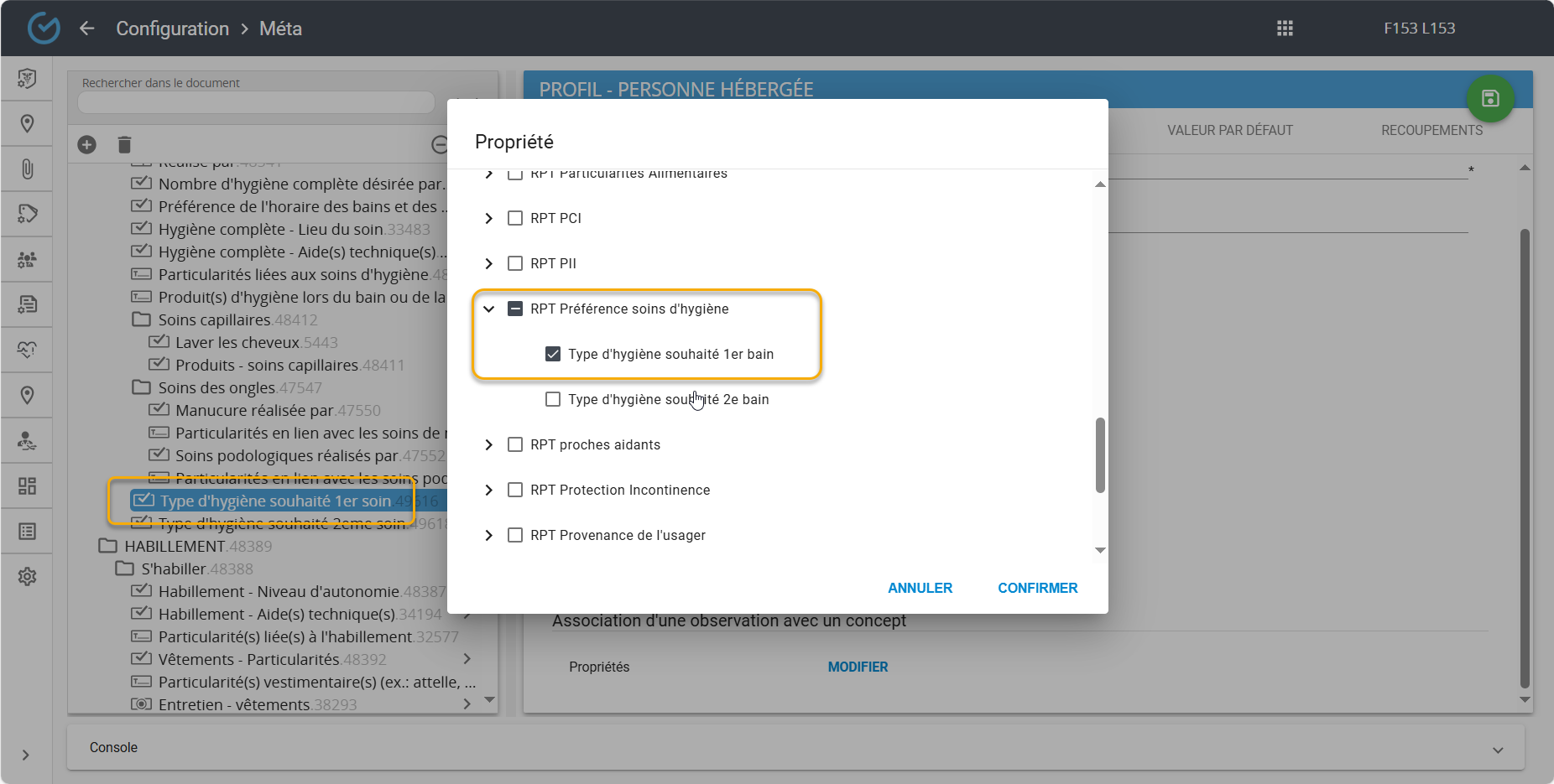 Chacune de ces observations doivent être associées à la propriété correspondante. Par exemple, l'observation ''Type d'hygiène souhaité 1er bain'' doit être associée à la propriété ''Type d'hygiène souhaité 1er bain'' de ce rapport: