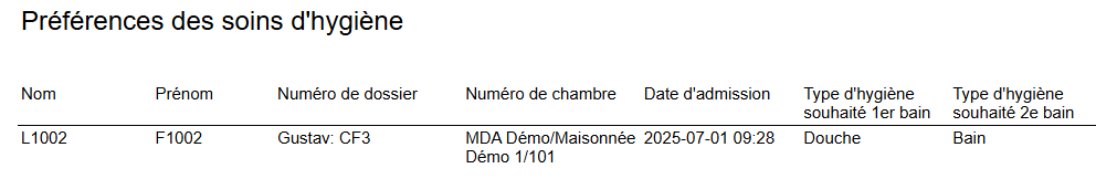 Le rapport affiche les types d'hygiène pour les bains 1 et 2 d'un patient ayant un séjour actif.