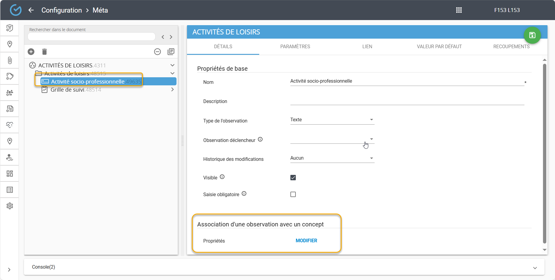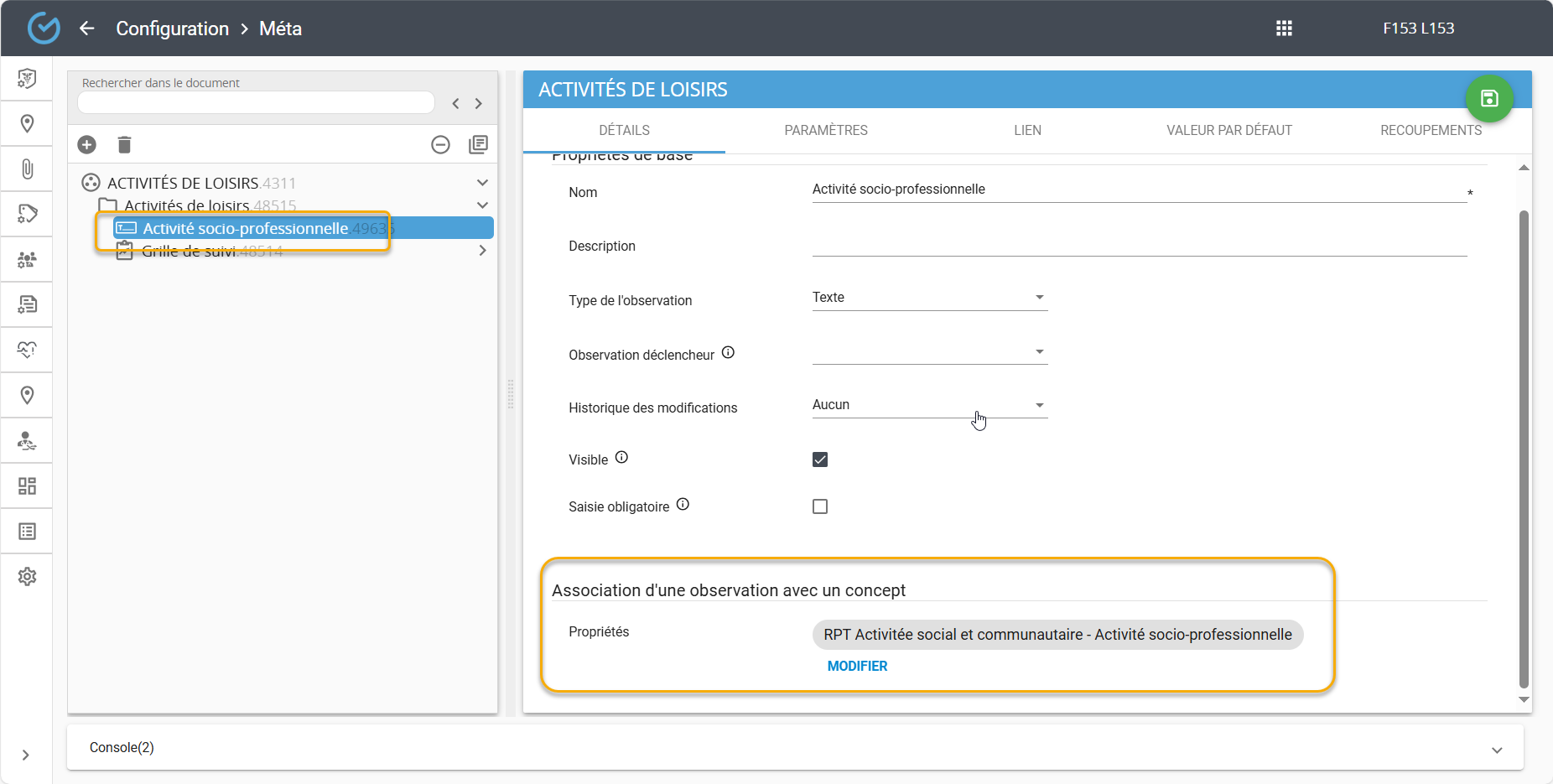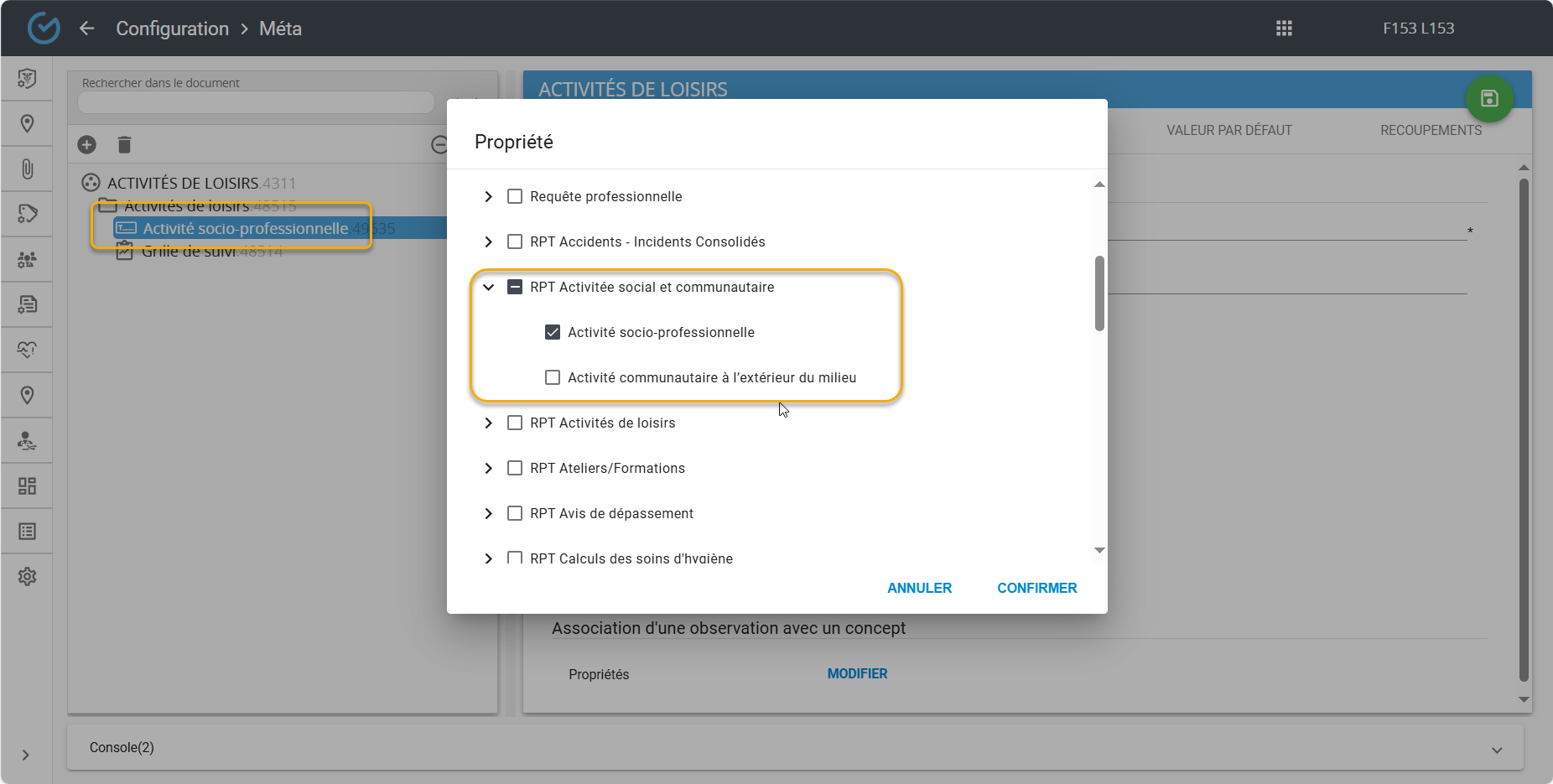Chacune de ces observations doivent être associées à la propriété correspondante. Par exemple, l'observation ''Activité socio-professionnelle'' doit être associée à la propriété ''Activité socio-professionnelle'' de ce rapport: