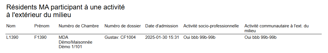 Le rapport affiche les activités que participe un usager ayant un séjour actif à l'extérieur de la Maison Alternative (MA).