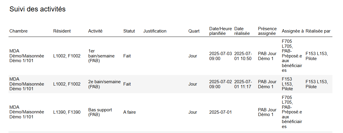 Ce rapport affiche les statuts des activités planifiées pour un patient ayant un séjour actif.