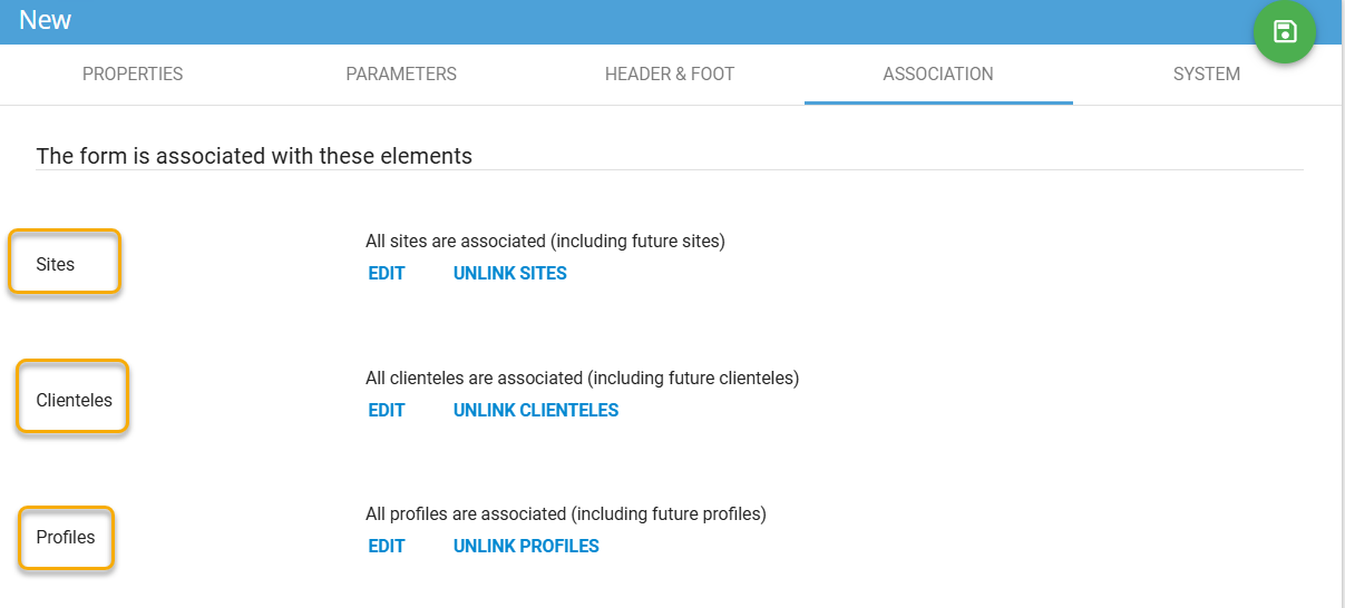 All sites, clienteles groups, and profiles are associated by default. To remove any selections, you must do so manually by clicking on Edit.