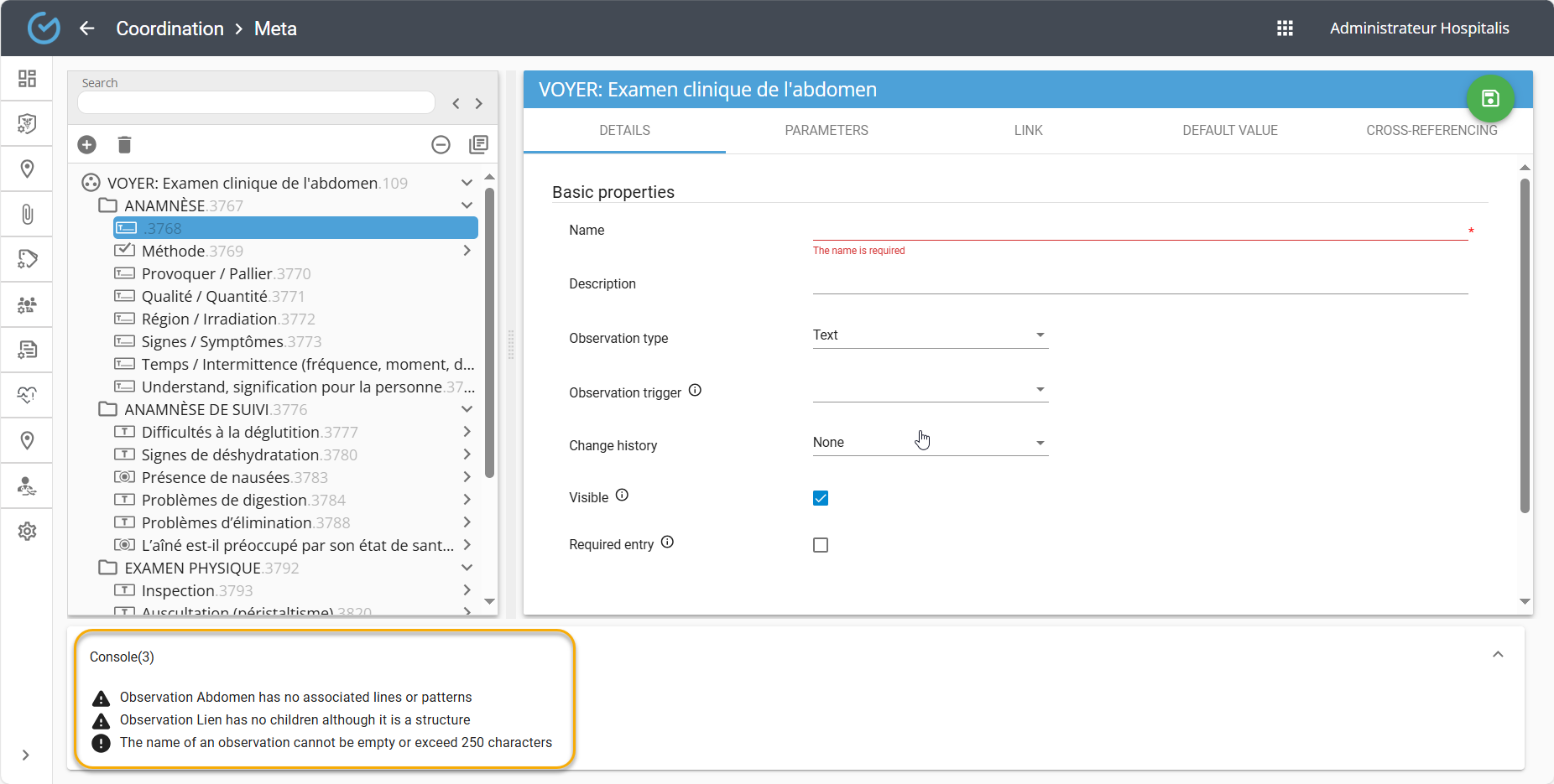 The console displays the description of elements that must be reviewed in the observations before publishing a form: