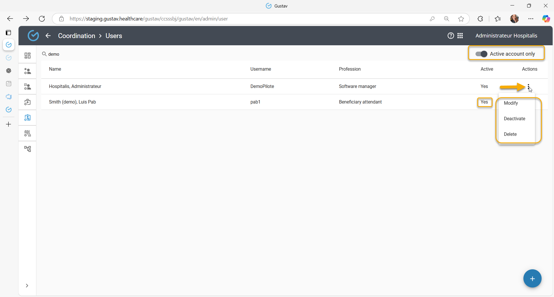 It is possible to reactivate a deleted account by simply disabling the Active Account function. You will find the accounts that have been deactivated. Use the three dots to reactivate the account: