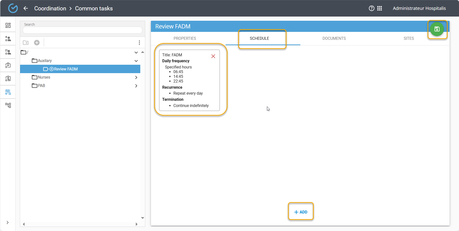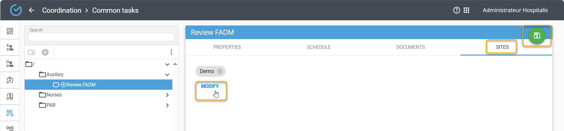 Define the establishment’s sites concerned by the task and save: