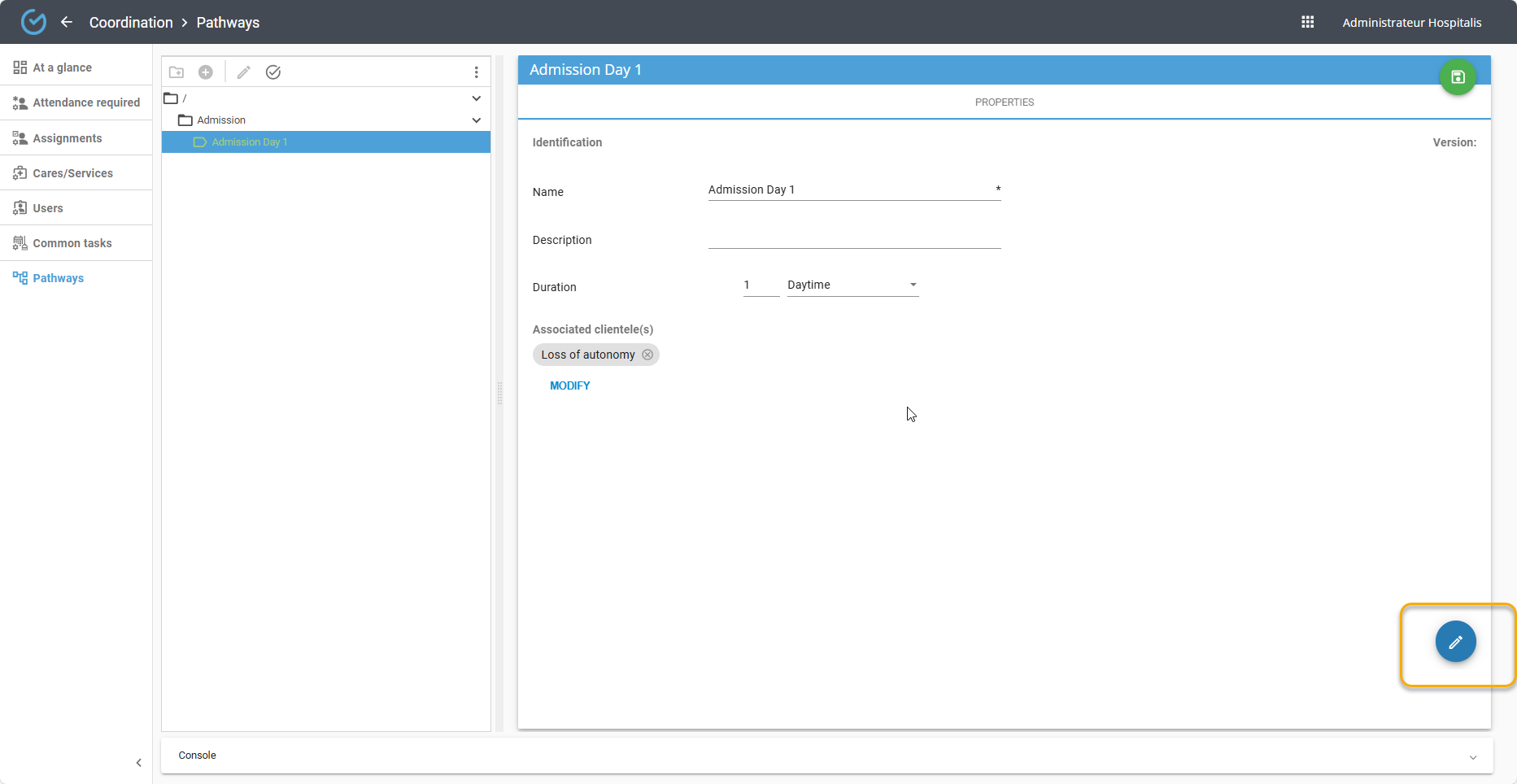 Once the save is complete, the Pathway is highlighted in green (edit mode). Click the pencil icon at the bottom right to configure the Pathway activities: