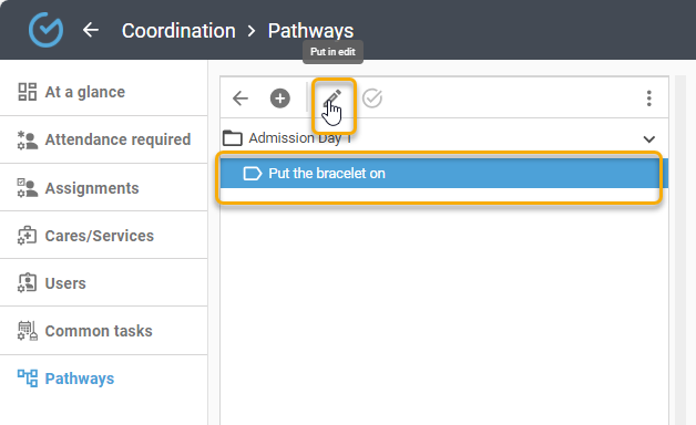 To modify a Pathway activity, select the activity (highlighted in blue) and click the pencil icon to enter edit mode: