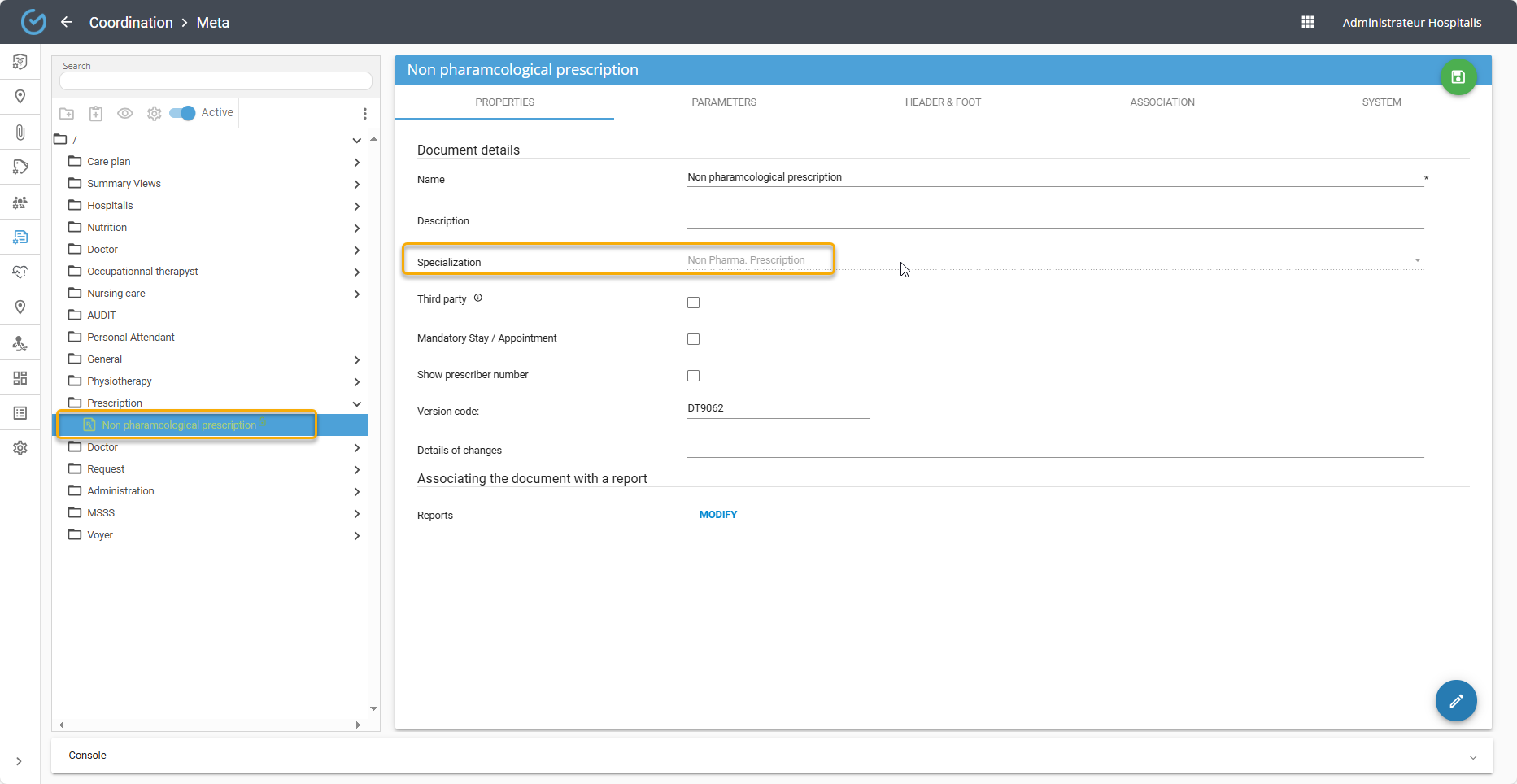 In the configuration settings of your META document, select the desired order type — in this case, Non-Pharmacological Prescription.