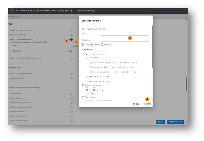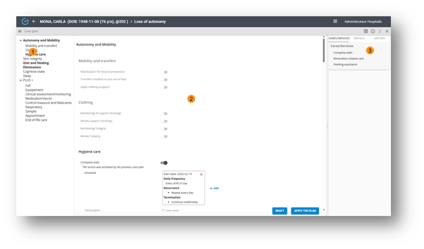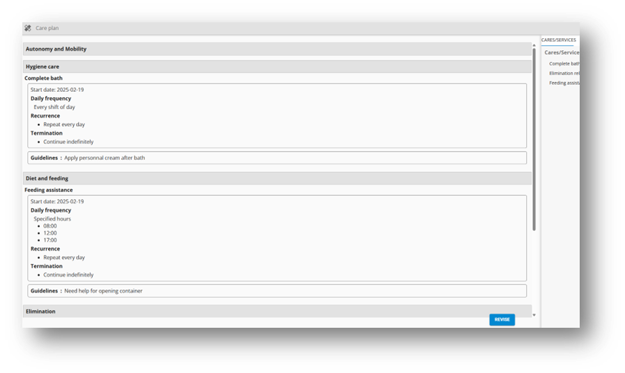 The care plan allows the scheduling of the user’s care/services, which are generated in the work routines.