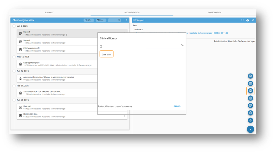 From the chronological view, click the care plan icon and select the plan from the library.