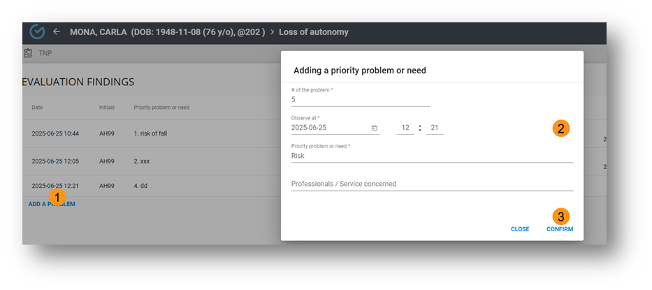 3. Enter the date and time, priority problem or need, profession or services involved and confirm
