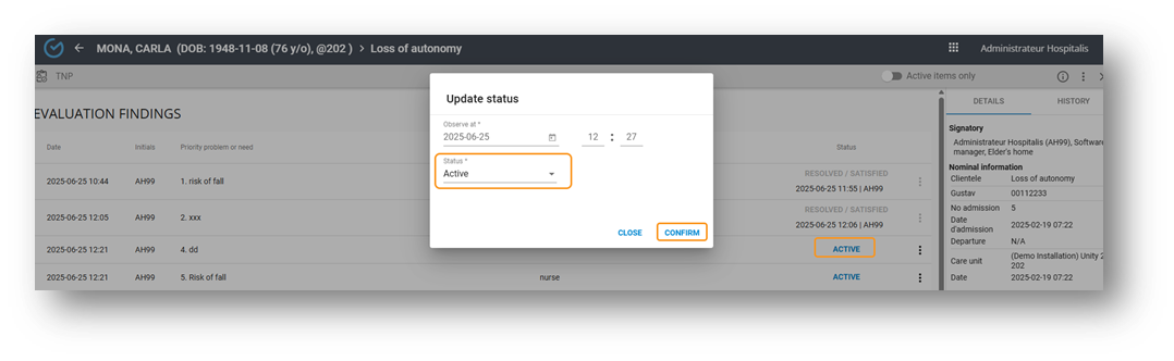 To modify the status, select “Status” button, select the new status and confirm