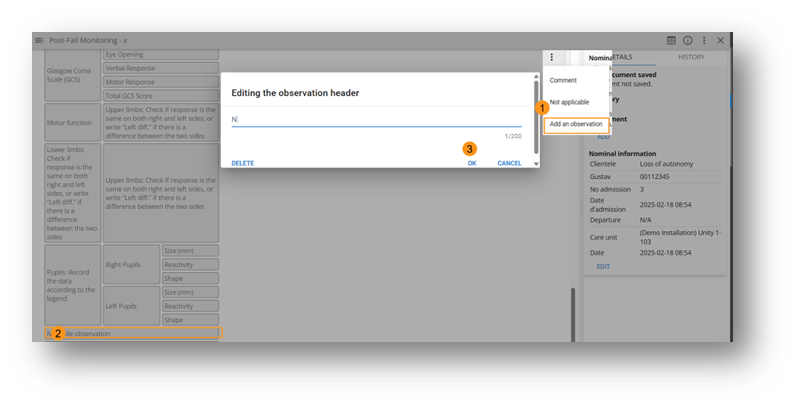 Depending on its configuration, a follow-up may allow multiple instances — for example, to create several wound follow-ups. When creating a new instance, entering a subtitle is mandatory to help distinguish it during record consultation and in the library.
