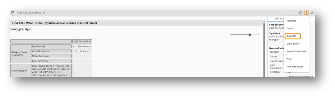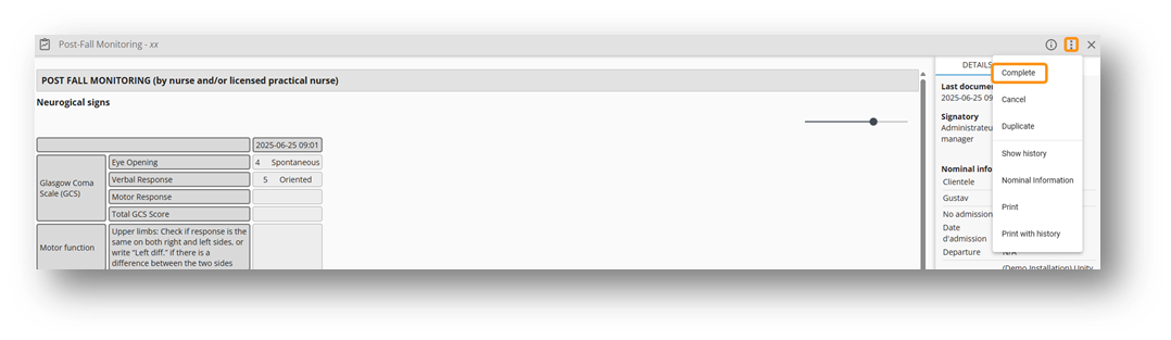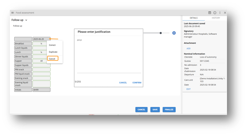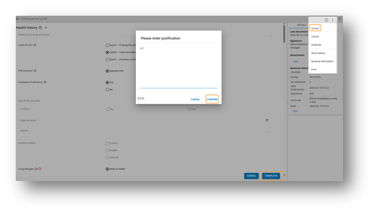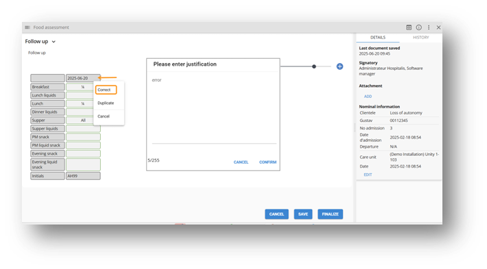 From the three dots, it is possible to correct a finalized document. A justification will be required before making any changes. The correction details are available from the History tab.