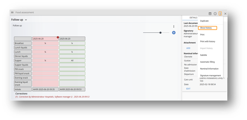 From the three dots, it is possible to correct and entry. The correction history is available by selecting “Show History” from the three-dot menu.