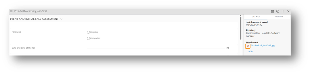 You can attach one or more files (JPEG, PDF, or PNG format) to documents, with a maximum file size of 45 MB. The attachment can be removed by selecting the (x) icon.