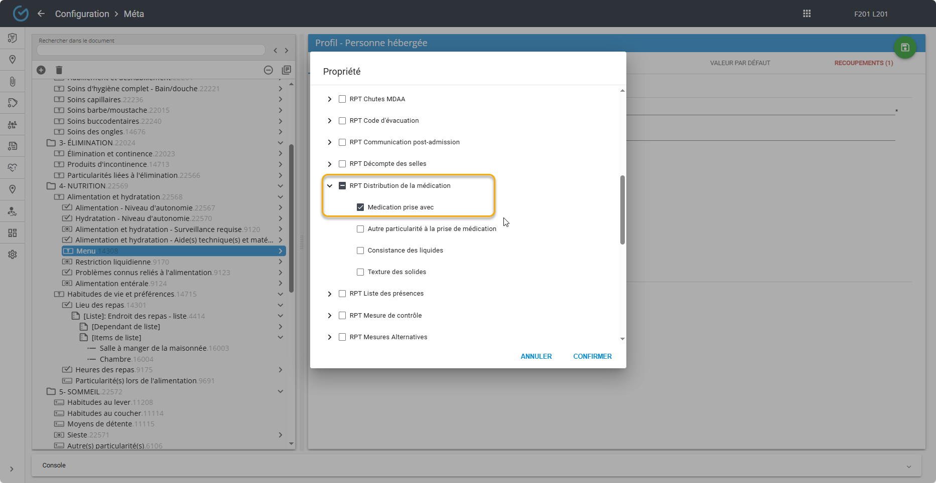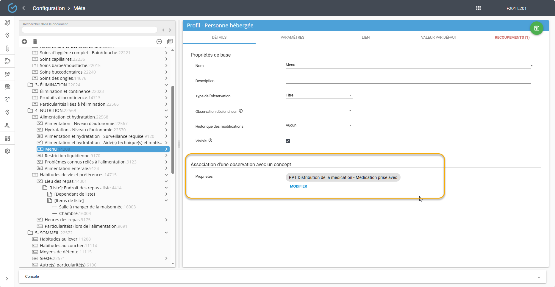Chacune de ces observations doivent être associées à la propriété correspondante. Par exemple, l'observation ''Menu'' doit être associée à la propriété ''Médication prise avec'' de ce rapport: