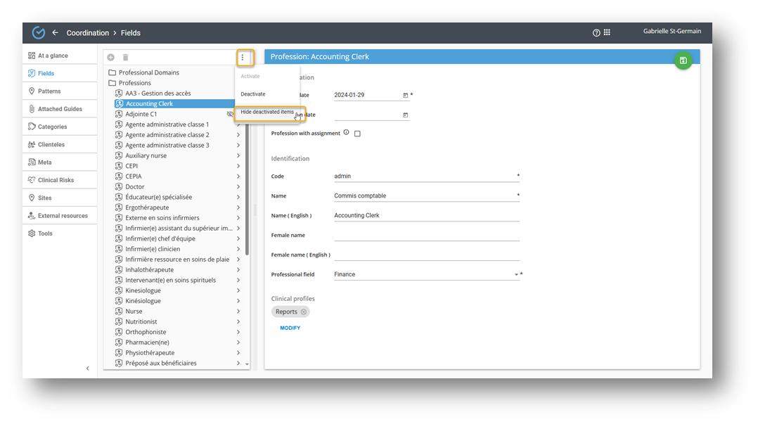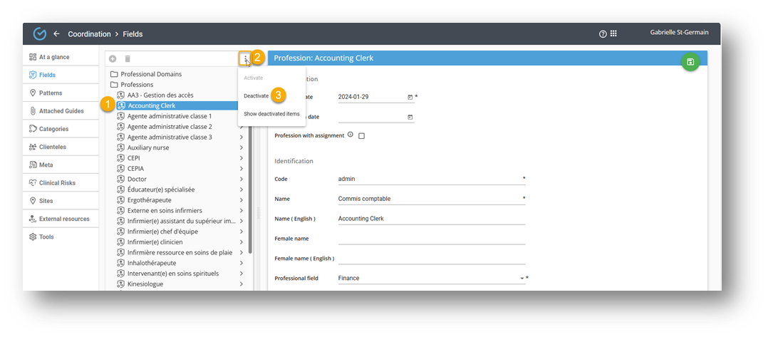 Note: Deactivating a profession prevents its use while preserving its configuration and historical data for future reference.