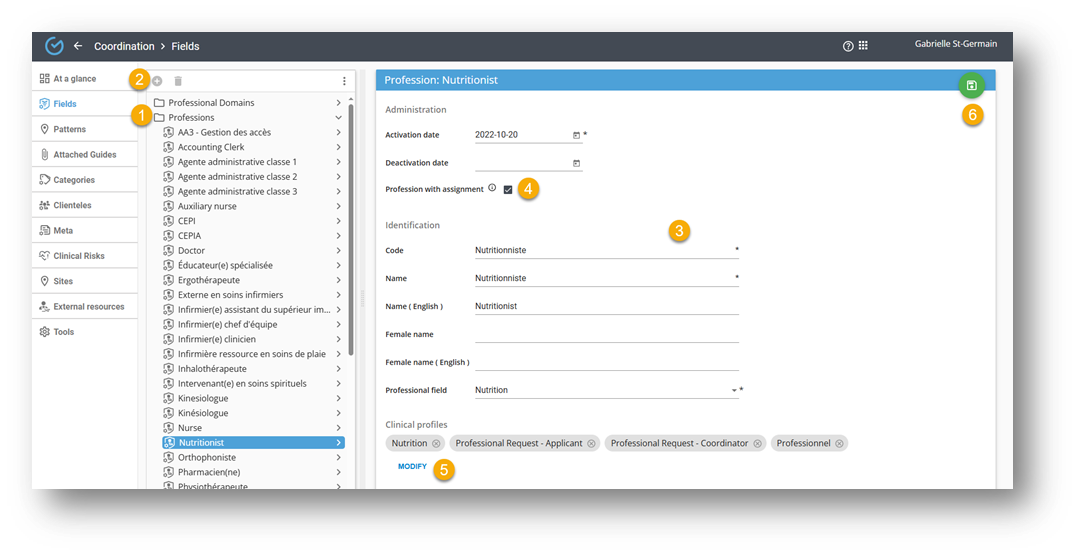 - Code: This will not be visible to the user. Create an identification code for the profession, which will appear on printed documents and be transmitted to archive systems for record classification (if required).