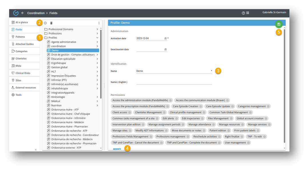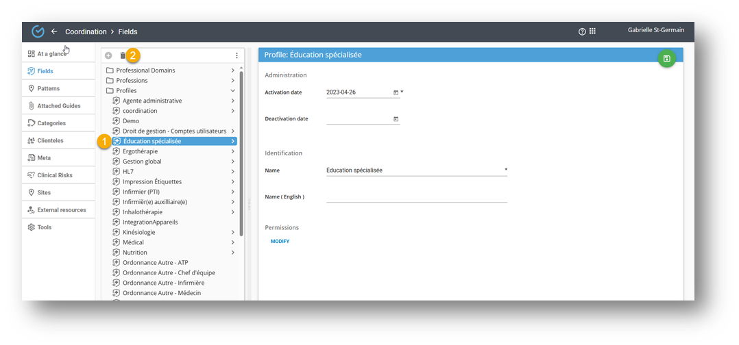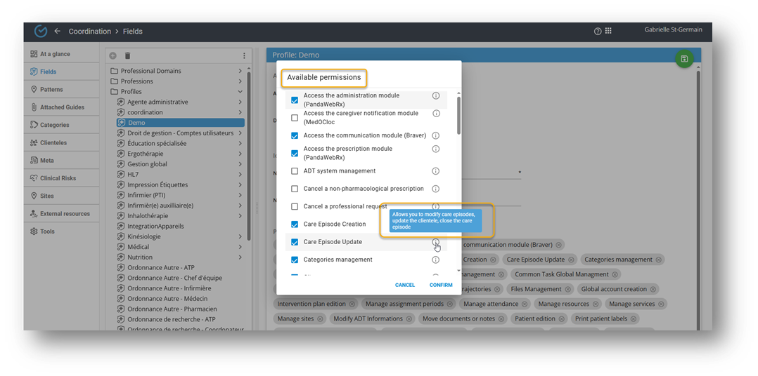 - Using the "Edit" button, select the clinical profiles to associate permissions for this profession. These profiles must have been configured beforehand in the Profiles section.