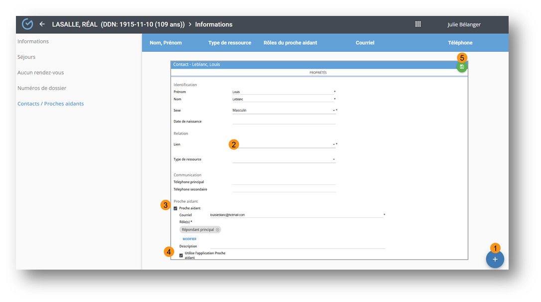 - Si le contact est un proche-aidant : a. Cochez la case indiquant qu’il s’agit d’un proche-aidant. b. Entrez son adresse courriel. c. Cliquez sur « Modifier » pour accéder aux options supplémentaires. d. Sélectionnez le rôle approprié et confirmez. e. Ajoutez une description, si souhaité (champ optionnel).