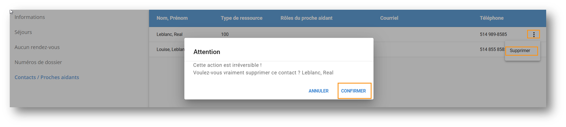 Pour supprimer un contact de la liste, cliquez sur les trois points situés à droite de son nom. Ensuite, sélectionnez l’option « Supprimer » dans le menu et confirmer la suppression: